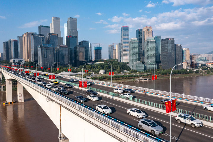 2025年10月1日,車(chē)輛行駛在掛滿(mǎn)國(guó)旗的重慶黃花園嘉陵江大橋上(無(wú)人機(jī)照片)。新華社記者 黃偉 攝