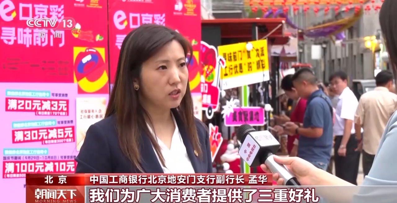 中國工商銀行北京地安門支行副行長 孟華:我們?yōu)閺V大消費者提供了三重好禮,除了傳統(tǒng)的消費滿減活動以外,我們還疊加了數(shù)字人民幣的優(yōu)惠支付,同時還設計了數(shù)字人民幣的打卡活動。