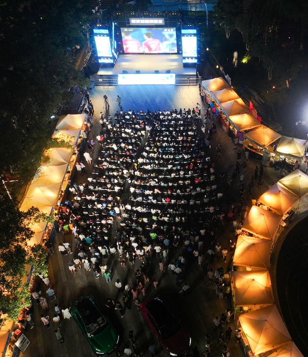 8月17日,球迷在南京一個(gè)露天屏幕前觀看2025江蘇省城市足球聯(lián)賽(“蘇超”)第九輪比賽。新華社記者 季春鵬 攝