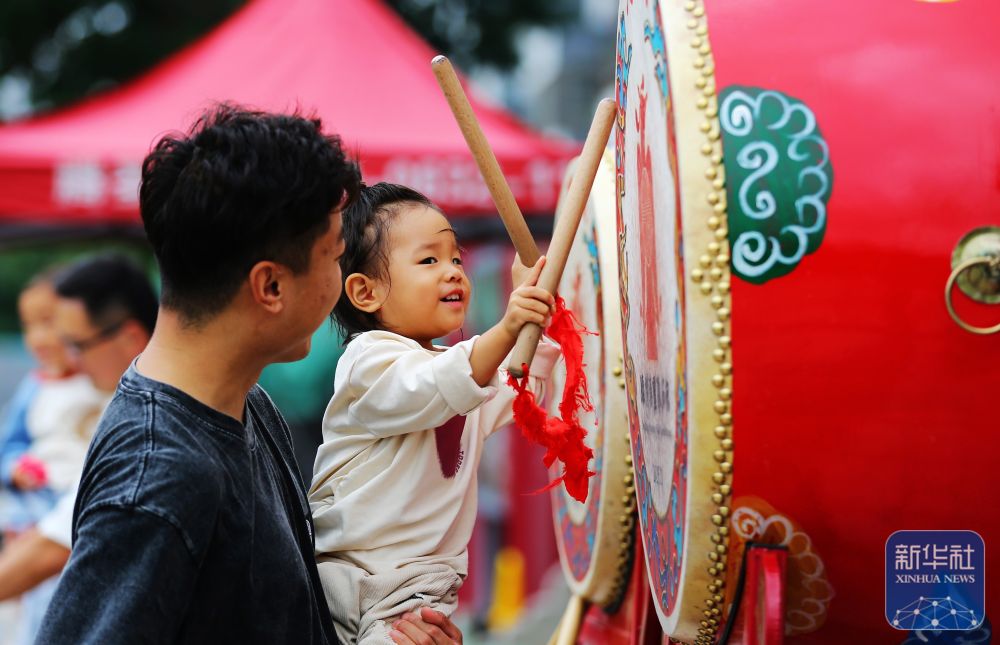↑ 10月6日,在山東省滕州漢畫(huà)像石館門(mén)外,家長(zhǎng)陪著孩子體驗(yàn)擊鼓。新華社發(fā)(李志軍攝)