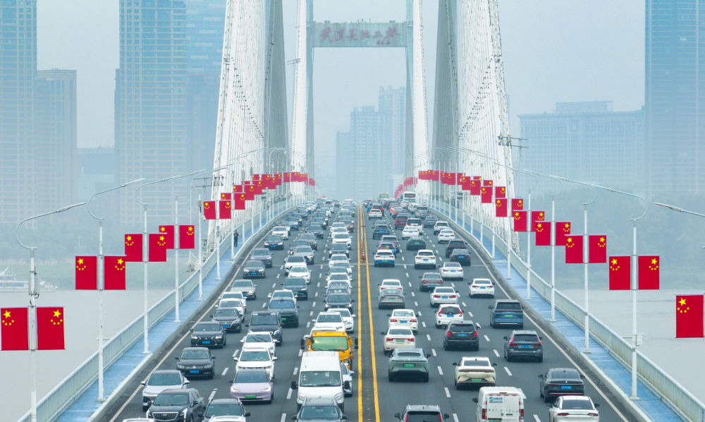 國(guó)慶假期第一天,各地迎來出行高峰。這是車輛行駛在湖北省武漢長(zhǎng)江二橋上(無人機(jī)照片,10月1日攝)。新華社記者 肖藝九 攝