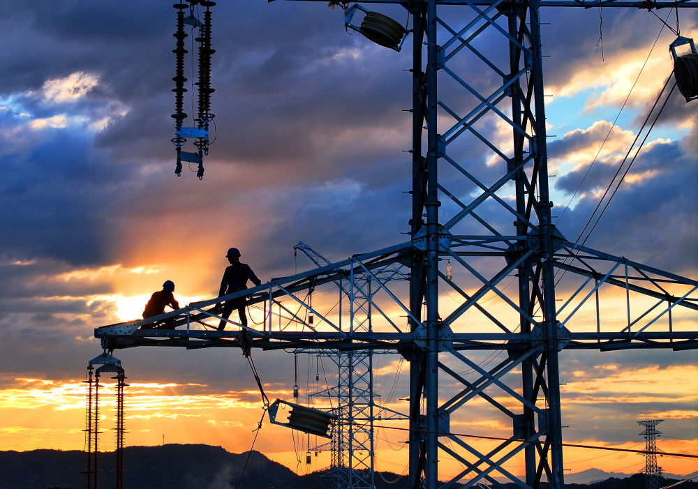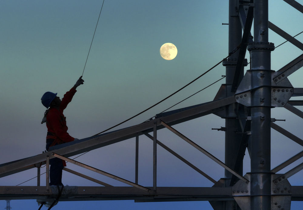 10月6日,在湖南省衡陽(yáng)市雁峰區(qū),高塔架線工人在月光的映射下施工(無人機(jī)照片)。新華社發(fā)(曹正平攝)