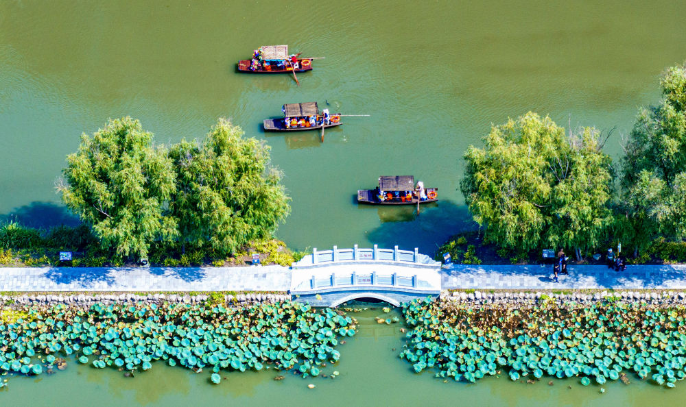 10月7日,游客在江蘇興化里下河國(guó)家濕地公園乘船游玩(無人機(jī)照片)。新華社發(fā)(周社根攝)