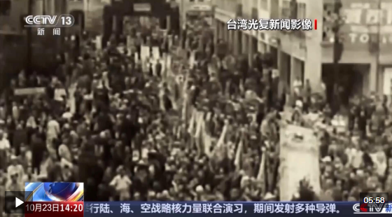 “10月25號(hào),日本代表在臺(tái)北中山堂簽字投降。淪陷五十年的臺(tái)灣,重回祖國懷抱。萬千的臺(tái)灣同胞,再見天日,重獲自由,在街上熱烈慶祝?!?/p>
