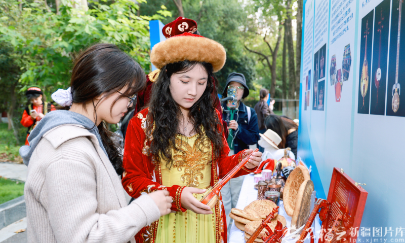 10月27日下午,南京師范大學(xué)(隨園校區(qū))學(xué)生在欣賞新疆樂器。石榴云/新疆日?qǐng)?bào)記者 甘興華攝