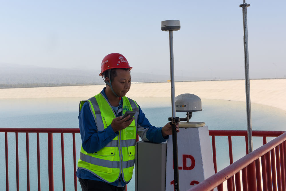 ↑ 11月1日,施工人員在奧吞勒克水庫檢查閘控系統(tǒng)設(shè)備試運(yùn)行情況。