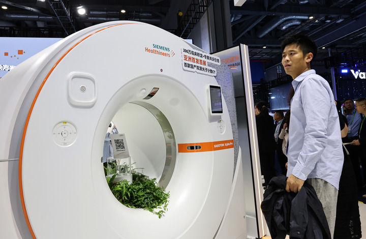 2025年11月6日,參觀者在進(jìn)博會西門子公司展臺一個CT機(jī)展品旁駐足觀看,這是西門子公司首款國產(chǎn)雙源光子計數(shù)CT,也是該產(chǎn)品亞洲首發(fā)首展。新華社記者 方喆 攝
