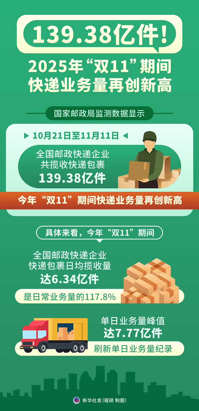 具體來看,今年“雙11”期間,全國郵政快遞企業(yè)快遞包裹日均攬收量達(dá)6.34億件,是日常業(yè)務(wù)量的117.8%;單日業(yè)務(wù)量峰值達(dá)7.77億件,刷新單日業(yè)務(wù)量紀(jì)錄。