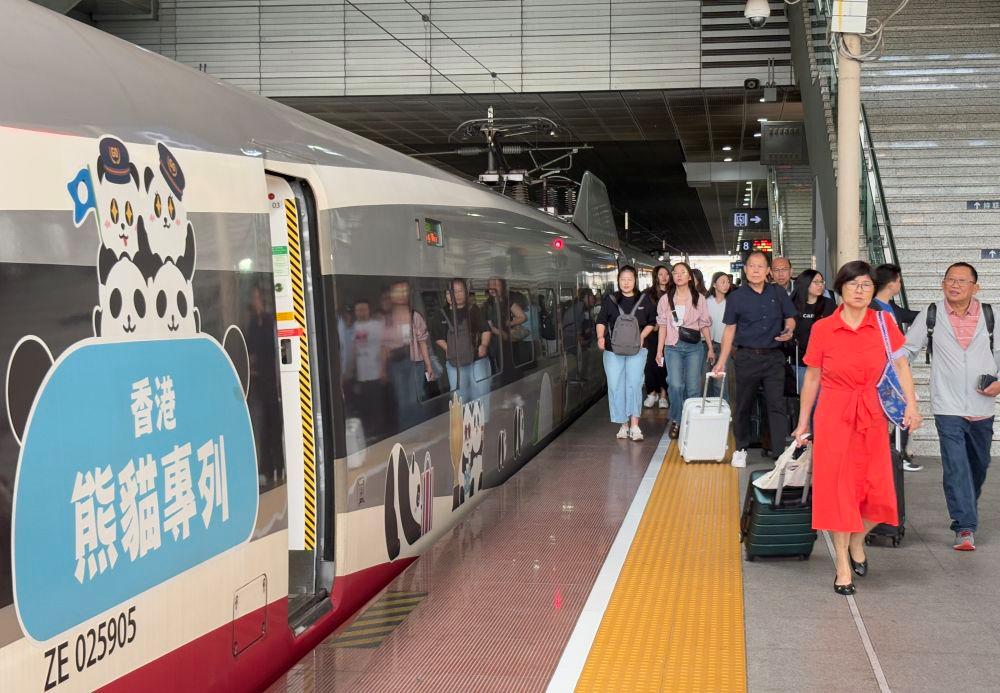 4月27日,往返深港的高鐵列車??吭谏钲诒闭菊九_。新華社發(fā)
