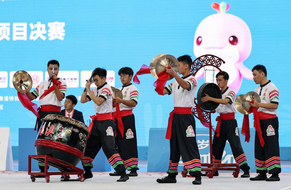 11月11日,粵港澳聯(lián)隊在第十五屆全國運動會群眾展演舞龍舞獅南獅自選項目決賽比賽中。新華社記者 王鵬 攝