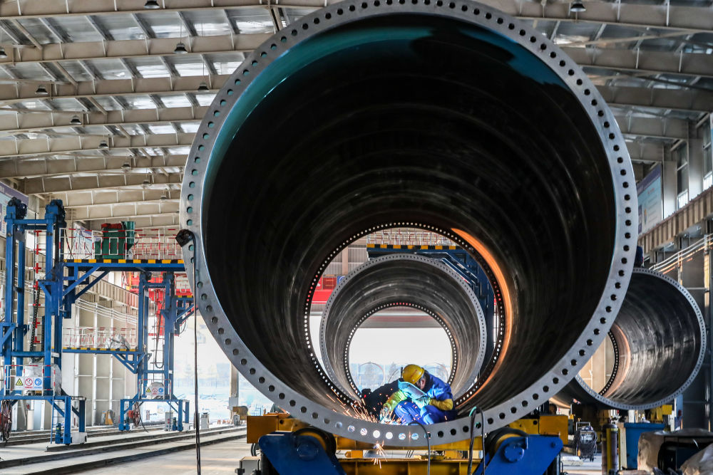 11月20日,在甘肅省酒泉經(jīng)濟(jì)技術(shù)開發(fā)區(qū)的中國水電四局(酒泉)新能源裝備有限公司塔筒制造車間,工作人員進(jìn)行風(fēng)機(jī)塔筒焊接作業(yè)。新華社記者 郎兵兵 攝