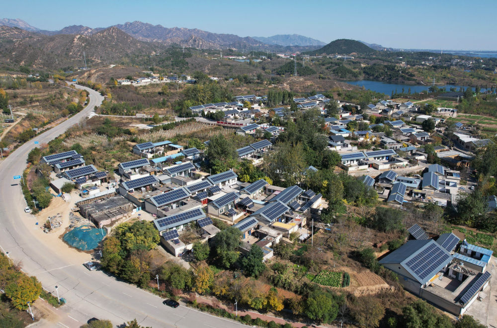 11月2日拍攝的河北省平山縣西柏坡鎮(zhèn)北莊村兆瓦級“光儲”智能微電網(wǎng)示范工程項目中的屋頂光伏發(fā)電板(無人機(jī)照片)。新華社記者 楊世堯 攝
