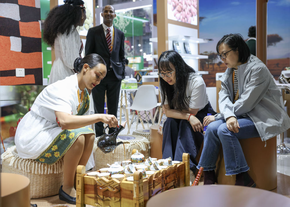 2025年11月7日,人們在第八屆進(jìn)博會國家展埃塞俄比亞館品嘗咖啡。新華社記者 孟晨光 攝