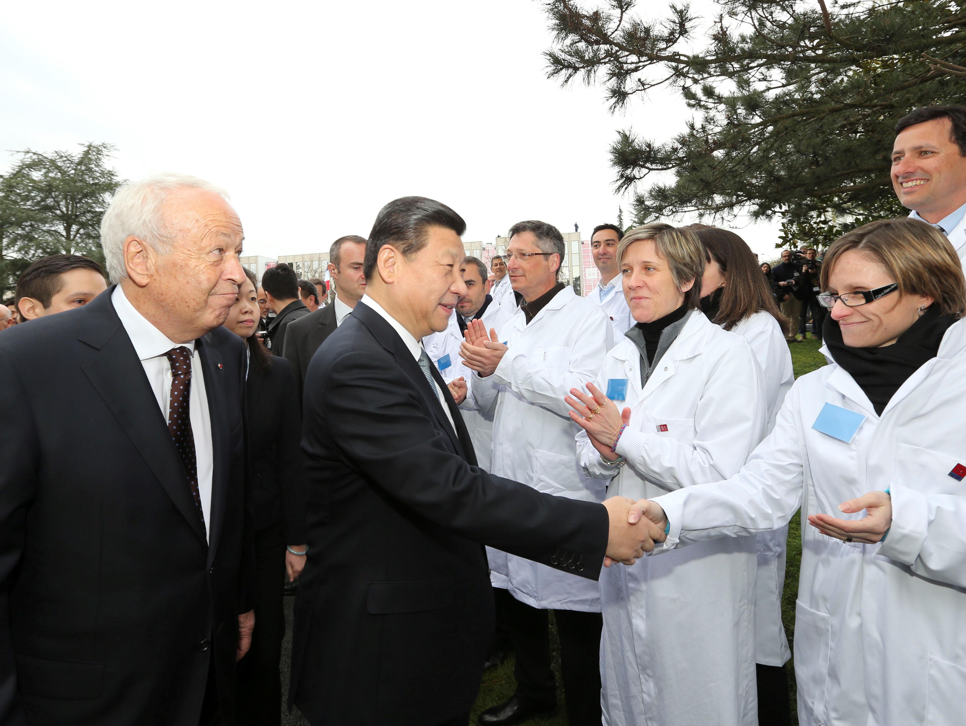 2014年3月26日,習近平主席在法國里昂參觀梅里埃生物科研中心,與科研中心員工握手。