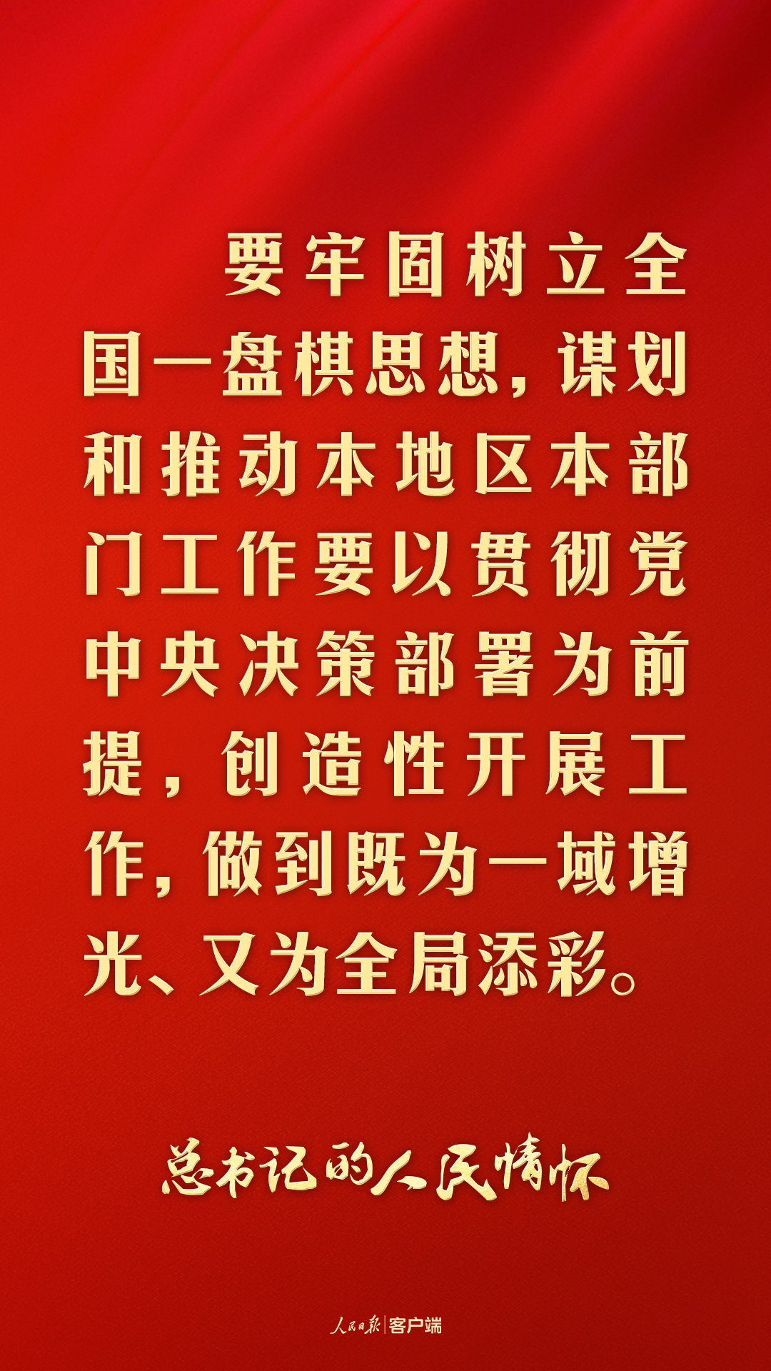“要牢固樹立全國一盤棋思想,謀劃和推動本地區(qū)本部門工作要以貫徹黨中央決策部署為前提,創(chuàng)造性開展工作,做到既為一域增光、又為全局添彩。”