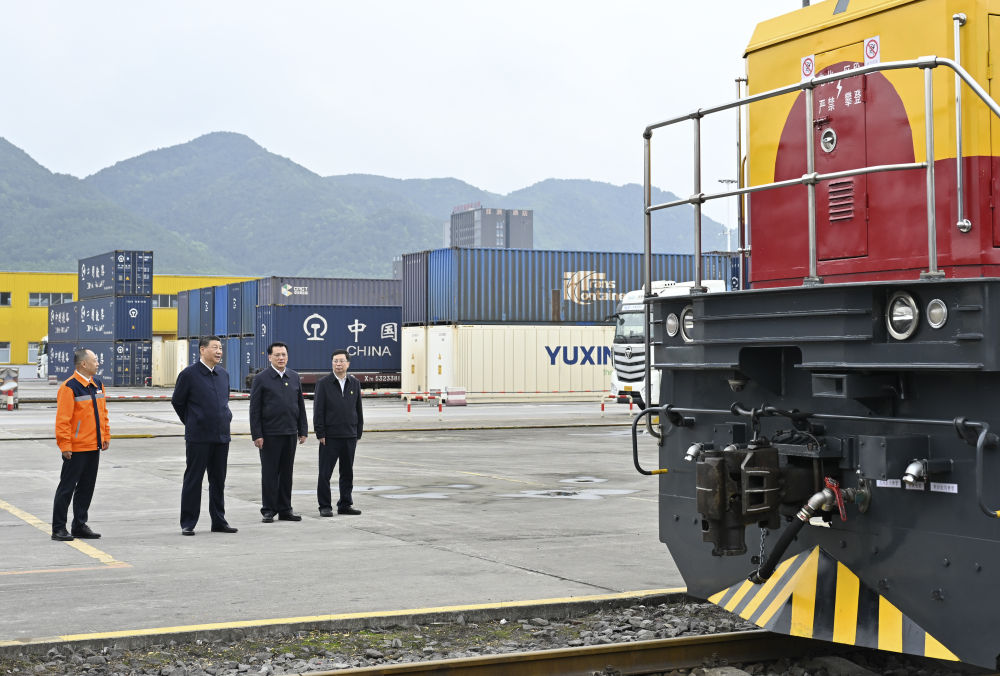 2024年4月22日,習(xí)近平總書記來到重慶國際物流樞紐園區(qū),了解當(dāng)?shù)丶涌旖ㄔO(shè)西部陸海新通道等情況。在一列滿載貨物的中歐班列前,習(xí)近平總書記駐足察看。新華社記者 岳月偉 攝