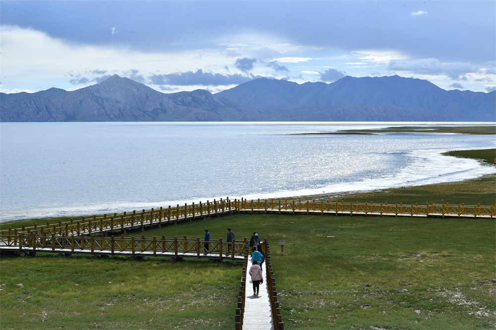 △ 游客行走在青海瑪多縣冬格措納湖畔的木棧道上。