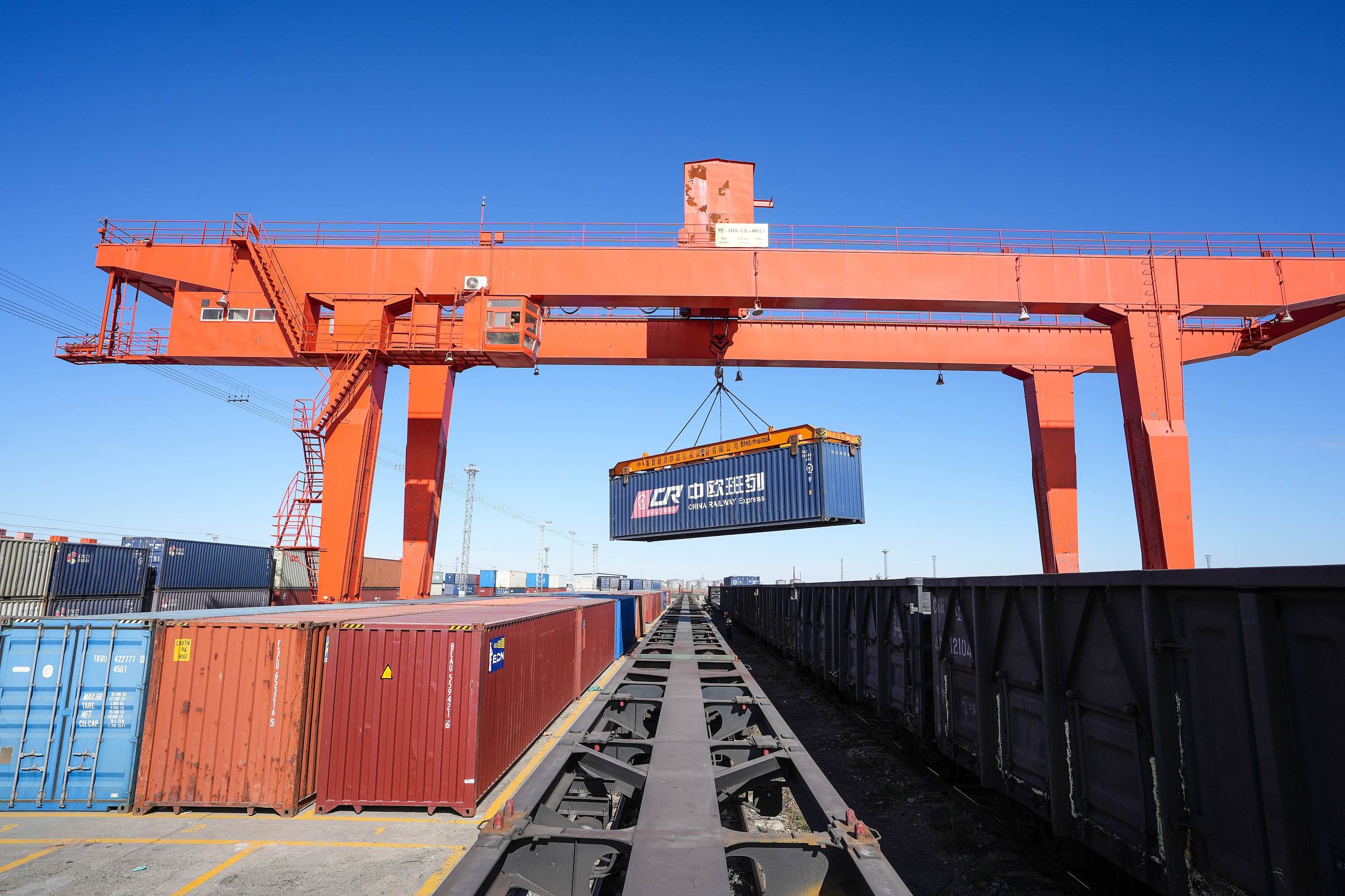 △ 內(nèi)蒙古錫林郭勒二連浩特口岸鐵路貨場(chǎng)內(nèi),龍門(mén)吊正在吊裝中歐班列集裝箱。