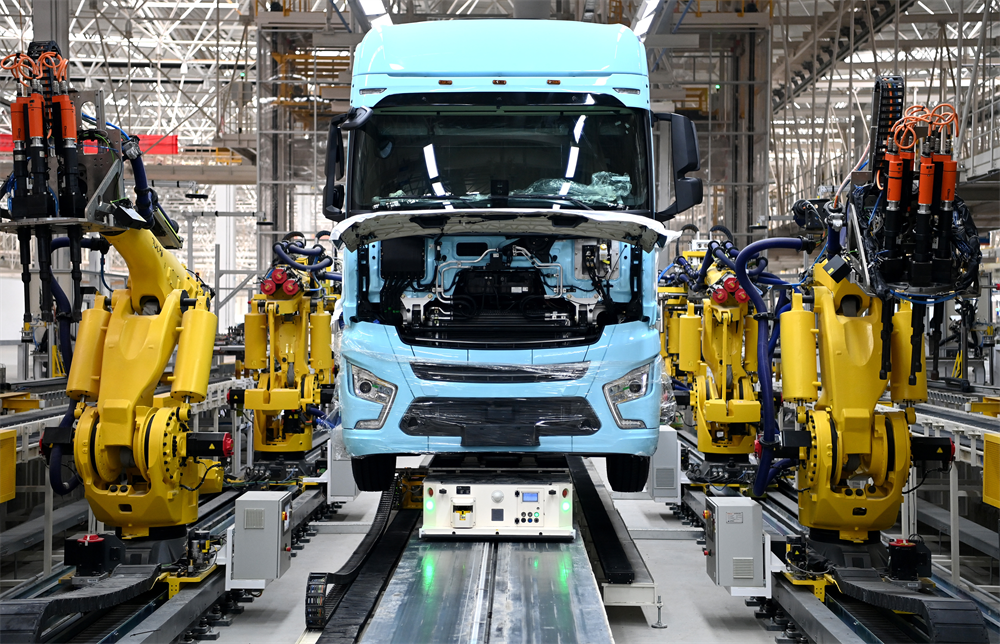 △ 一輛重卡在汽車(chē)總裝生產(chǎn)線輪胎自動(dòng)化裝配擰緊無(wú)人工作站進(jìn)行裝配。