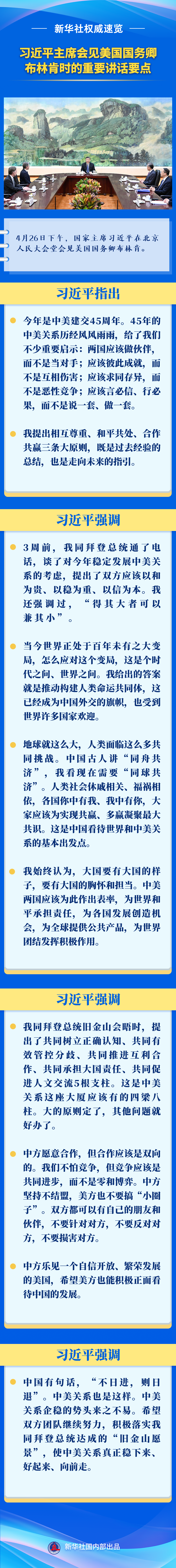 4月26日下午,國家主席習(xí)近平在北京人民大會堂會見美國國務(wù)卿布林肯。來看習(xí)近平主席的重要講話要點。