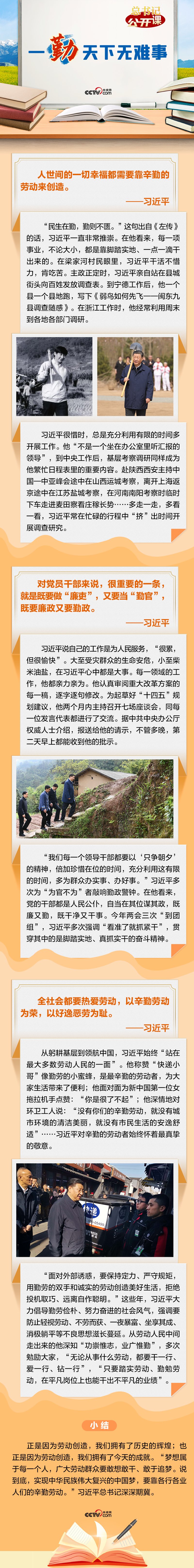 習近平總書記強調,“一勤天下無難事”,“實現(xiàn)中華民族偉大復興的中國夢,要靠各行各業(yè)人們的辛勤勞動”?!扒凇笔秦灤┛倳洀恼牡钠焚|,是對他夙夜在公、勤勉工作最為凝練的概括。