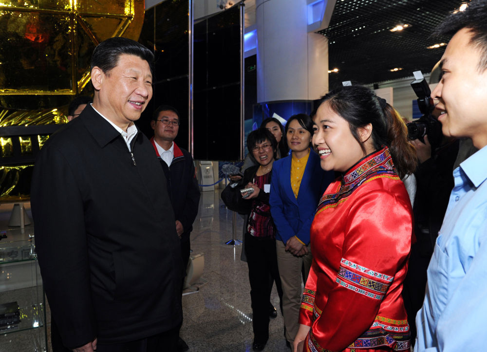 2013年5月4日,習(xí)近平來(lái)到中國(guó)航天科技集團(tuán)公司中國(guó)空間技術(shù)研究院,同各界優(yōu)秀青年代表座談并發(fā)表重要講話(huà)。這是座談會(huì)前,習(xí)近平和在展廳參觀的優(yōu)秀青年代表交談。