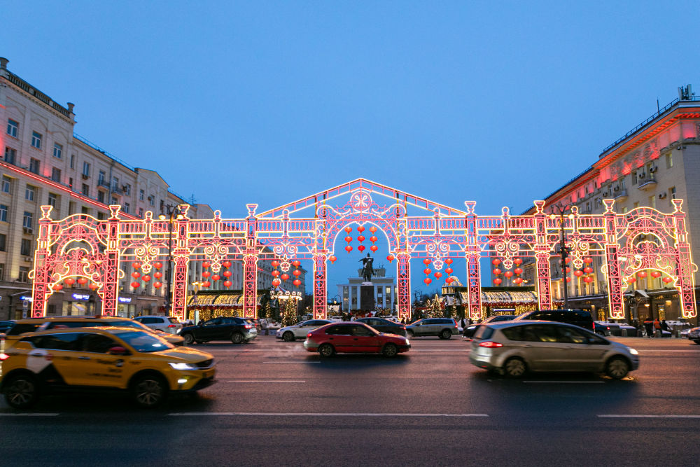 2024年2月9日,在俄羅斯首都莫斯科,車輛在中國(guó)新年主題裝飾前駛過(guò)。當(dāng)日,“莫斯科的中國(guó)新年”文化活動(dòng)在俄羅斯首都莫斯科市中心啟動(dòng)?! ⌒氯A社記者 白雪騏 攝