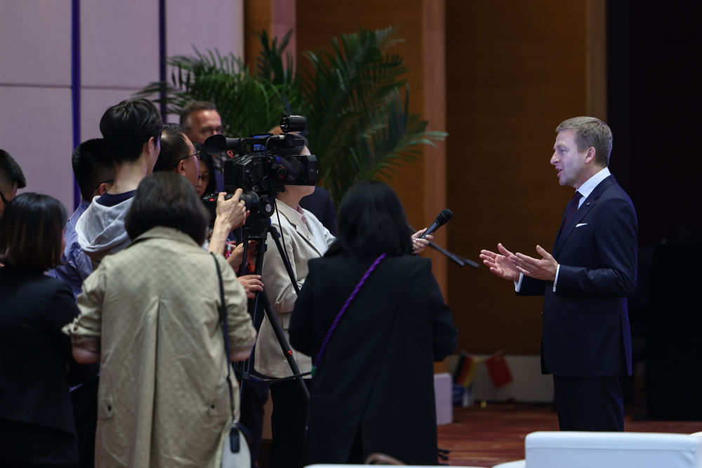 2024年4月26日,遼寧省沈陽(yáng)市與寶馬集團(tuán)深化戰(zhàn)略合作簽約儀式在沈陽(yáng)舉行,這是寶馬集團(tuán)董事長(zhǎng)齊普策接受采訪。 新華社記者 潘昱龍 攝