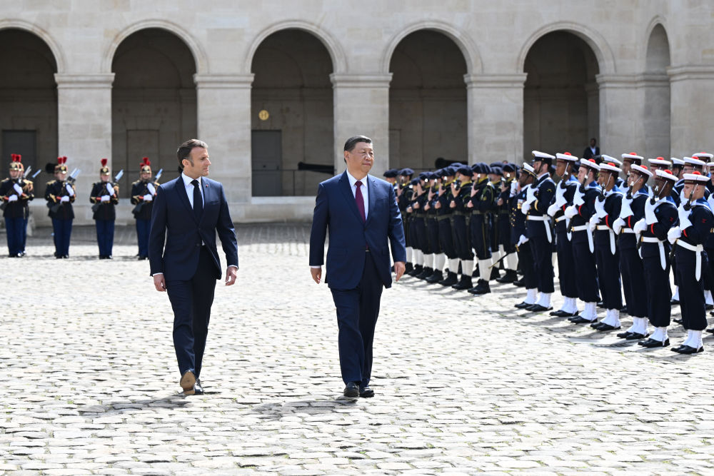 習近平和夫人彭麗媛乘車抵達時,馬克龍和夫人布麗吉特在下車處熱情迎接。在雄壯的進行曲中,兩國元首步入廣場。軍樂團奏中法兩國國歌。兩國元首檢閱法蘭西共和國衛(wèi)隊和陸??杖妰x仗隊,并觀看分列式。隨后,習近平和彭麗媛同法方主要官員一一握手致意。馬克龍夫婦同中方陪同人員分別握手致意。