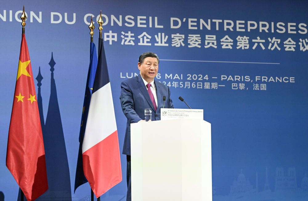 當?shù)貢r間5月6日下午,國家主席習近平在巴黎同法國總統(tǒng)馬克龍共同出席中法企業(yè)家委員會第六次會議閉幕式,并發(fā)表題為《繼往開來,攜手開創(chuàng)中法合作新時代》的重要致辭。兩國元首同中法企業(yè)家代表合影,隨后共同步入劇院禮堂。