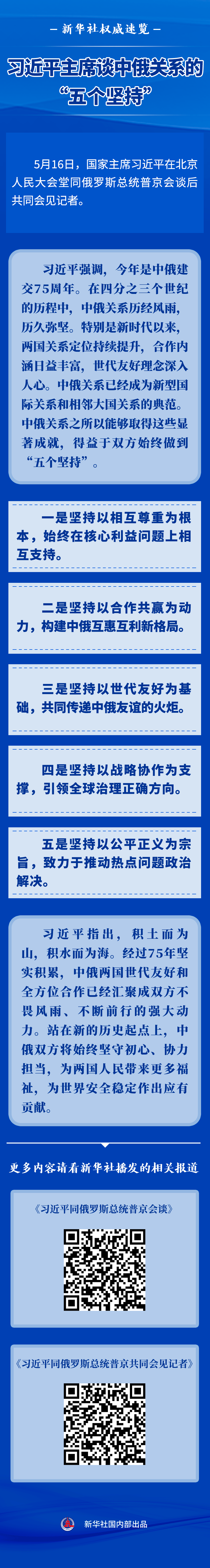 5月16日,國家主席習(xí)近平在北京人民大會(huì)堂同俄羅斯總統(tǒng)普京會(huì)談后共同會(huì)見記者。習(xí)主席談到中俄關(guān)系的“五個(gè)堅(jiān)持”。