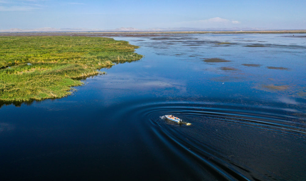 2023年9月15日,河湖濕地水環(huán)境保護(hù)與修復(fù)技術(shù)研究團(tuán)隊(duì)在內(nèi)蒙古烏梁素海采集湖水樣本(無(wú)人機(jī)照片)。位于黃河“幾字彎”頂部的烏梁素海,是黃河流域最大的湖泊濕地,是控制京津風(fēng)沙源的天然生態(tài)屏障。近年來(lái),當(dāng)?shù)夭粩嗉訌?qiáng)烏梁素海綜合治理力度,生態(tài)環(huán)境持續(xù)好轉(zhuǎn)。