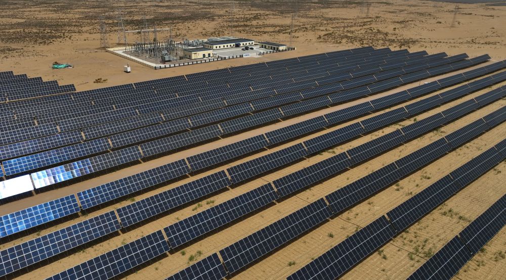 2024年5月16日在內(nèi)蒙古巴彥淖爾市磴口縣拍攝的烏蘭布和沙漠光伏基地(無(wú)人機(jī)照片)。烏蘭布和沙漠建設(shè)生態(tài)光伏基地,采取板上發(fā)電、板下種植的辦法,努力把沙海變?yōu)椤熬G?!薄?/p>