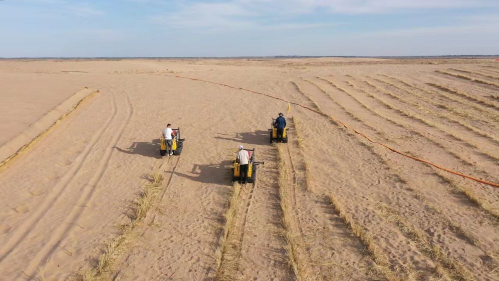 在內(nèi)蒙古巴彥淖爾市烏拉特后旗西補(bǔ)隆林業(yè)管護(hù)中心,4臺(tái)裝有履帶的壓沙機(jī)正在沙地里“插秧”——小推車大小的壓沙機(jī)前方都裝有一個(gè)直徑80厘米的大齒輪,壓沙機(jī)前進(jìn)一米,大齒輪就會(huì)將早已均勻鋪在沙地上的稻草、秸稈精準(zhǔn)“植”入沙地里。不一會(huì)兒,一條條金黃色的沙障“編織”完成,將沙丘牢牢縛住。