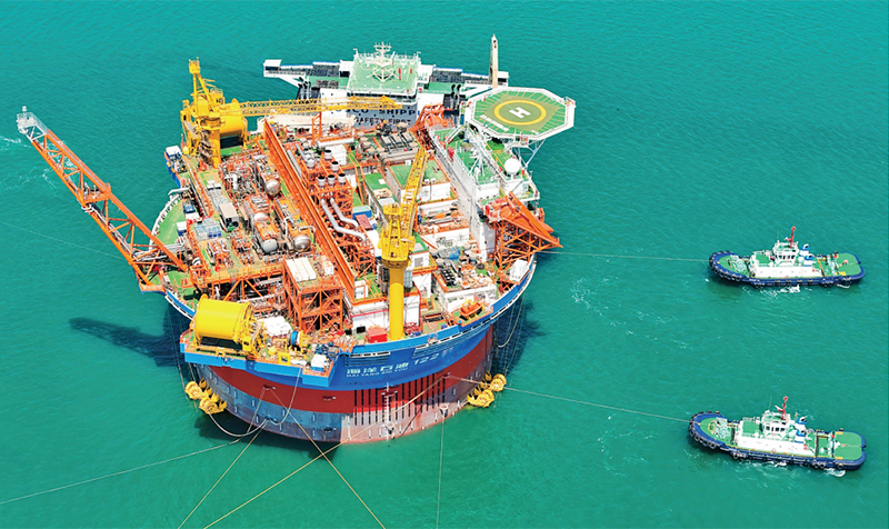 “海葵一號”,是亞洲首艘圓筒型浮式生產儲卸油裝置。該裝置集原油生產、存儲、外輸等功能于一體,被網友們昵稱為“超級能源碗”,也是完全由我國自主設計建造的海上油氣加工廠。圖為2024年5月12日,“??惶枴睆闹袊S颓鄭u國際化高端裝備制造基地離港啟運。 人民圖片 張進剛/攝