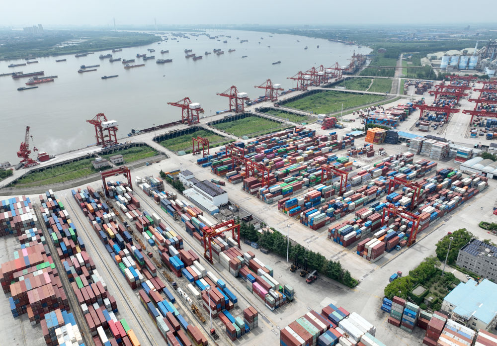 2024年6月1日拍攝的湖北武漢陽邏港(無人機(jī)照片)。2013年時,陽邏港僅有兩條集裝箱航線,船型小、班期少;如今,陽邏港已開通各類集裝箱航線20余條,實(shí)現(xiàn)“航運(yùn)向東入海、班列向西入歐”。