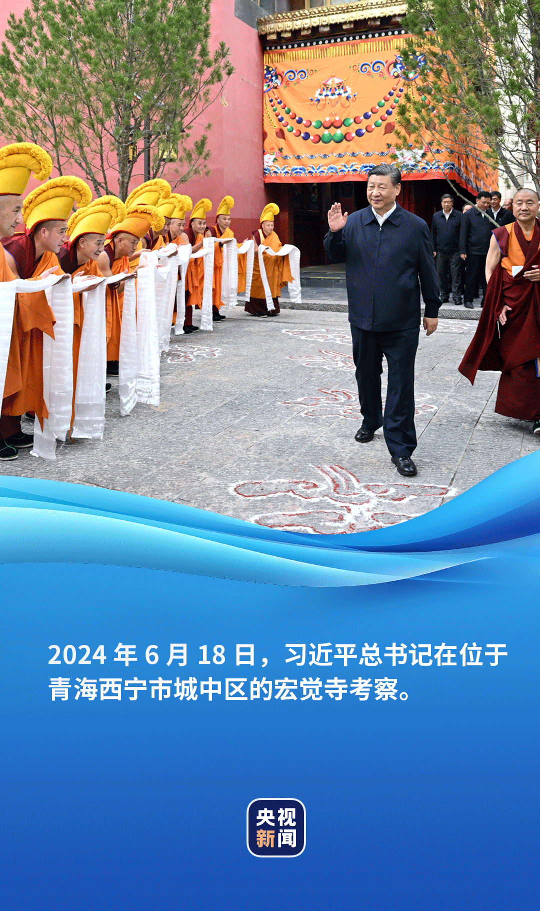 6月18日,正在青??疾斓牧?xí)近平總書記來到位于西寧市城中區(qū)的宏覺寺。在寺前院落,宏覺寺民主管理委員會(huì)負(fù)責(zé)人向總書記敬獻(xiàn)哈達(dá),僧人提香爐、持寶傘迎接總書記。