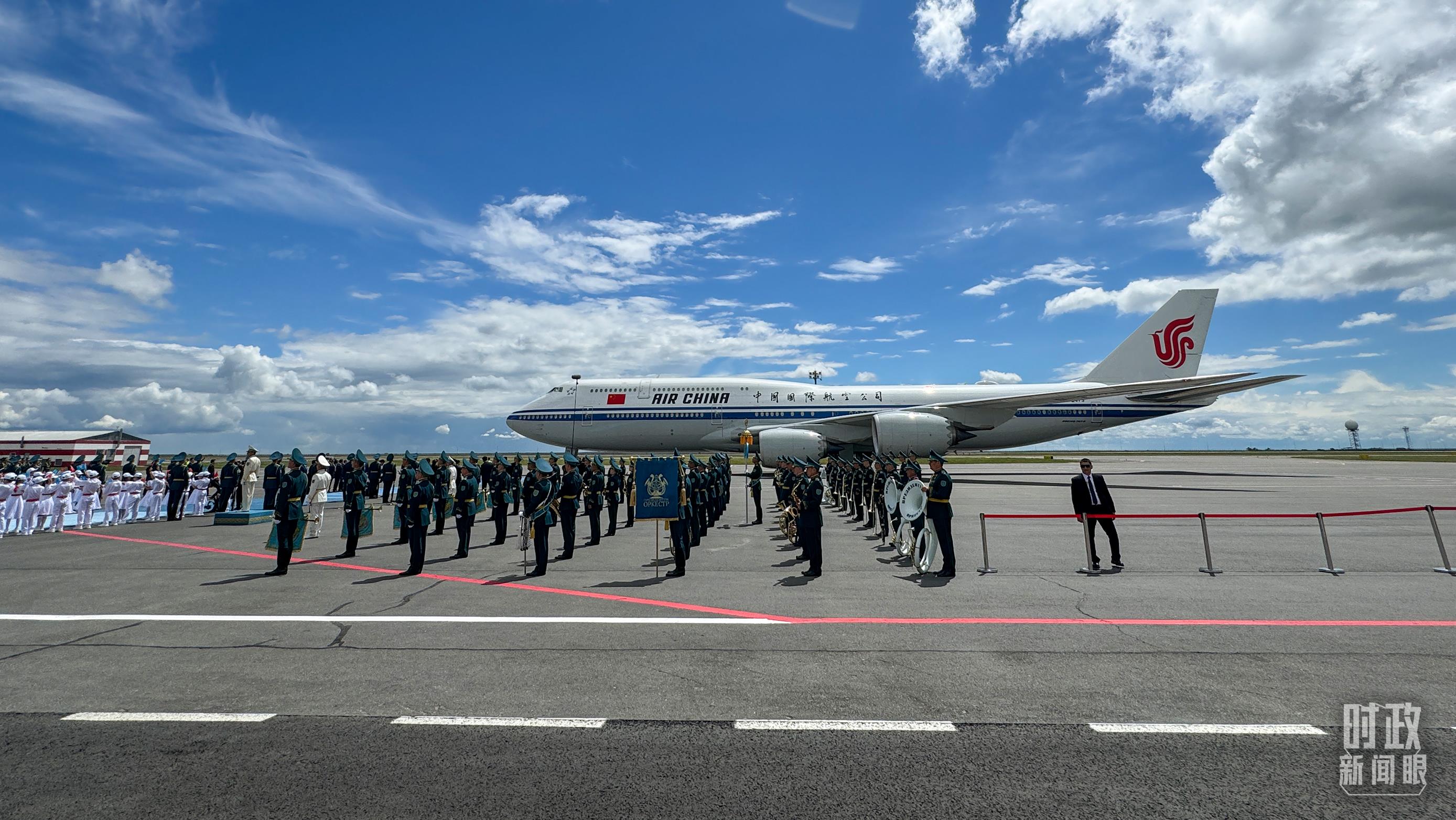 當(dāng)習(xí)近平主席乘坐的專(zhuān)機(jī)進(jìn)入哈薩克斯坦領(lǐng)空時(shí),哈薩克斯坦三架空軍戰(zhàn)機(jī)升空護(hù)航。專(zhuān)機(jī)抵達(dá)阿斯塔納納扎爾巴耶夫國(guó)際機(jī)場(chǎng)時(shí),托卡耶夫總統(tǒng)率政府第一副總理等高級(jí)官員熱情迎接。