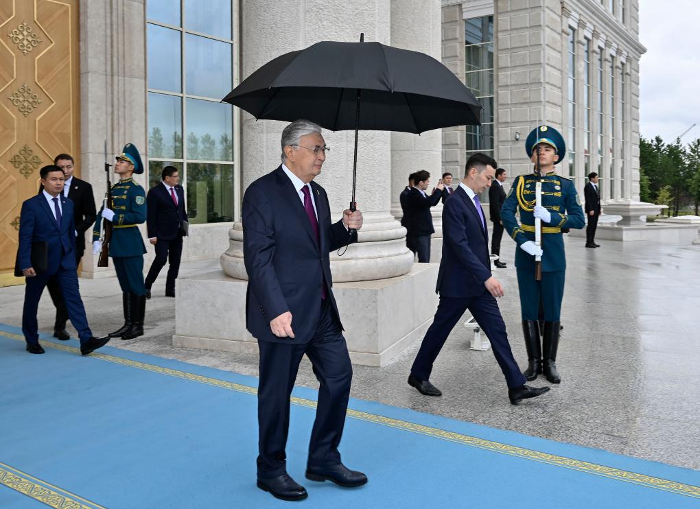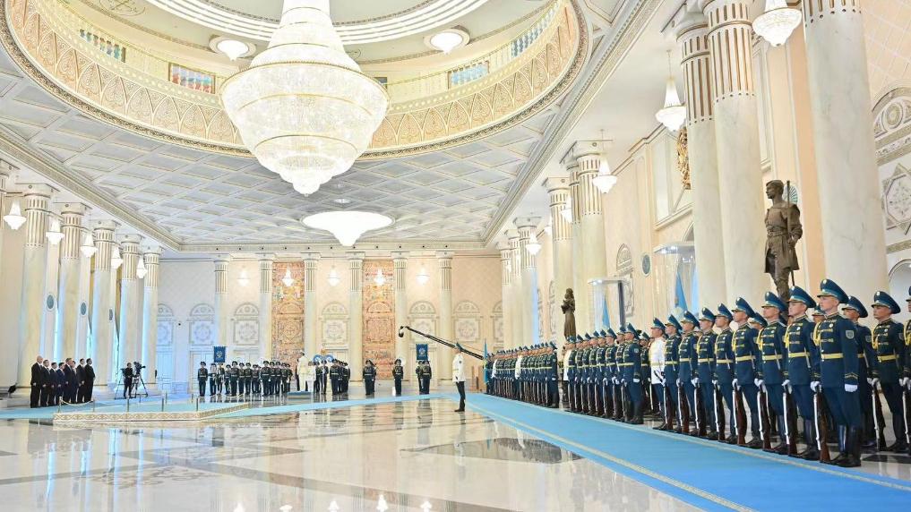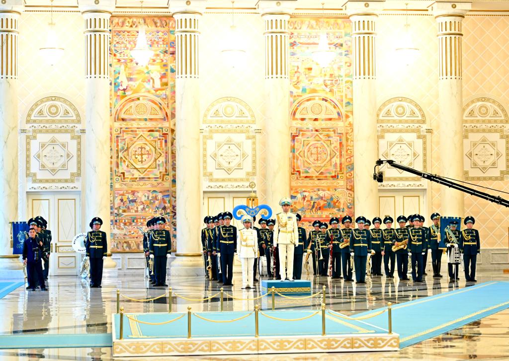托卡耶夫?yàn)榱?xí)近平舉行隆重歡迎儀式??偨y(tǒng)府大廳氣勢恢宏,禮兵威武挺拔。兩國元首分別同對方陪同人員一一握手致意。兩國元首登上檢閱臺,軍樂團(tuán)奏中哈兩國國歌。習(xí)近平在托卡耶夫陪同下檢閱儀仗隊。