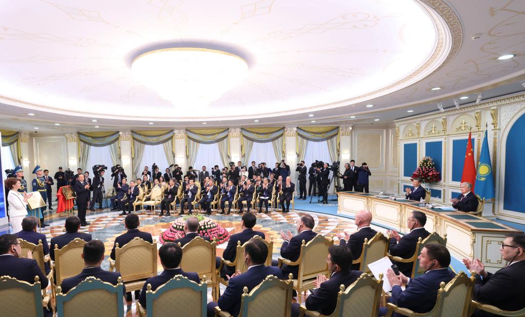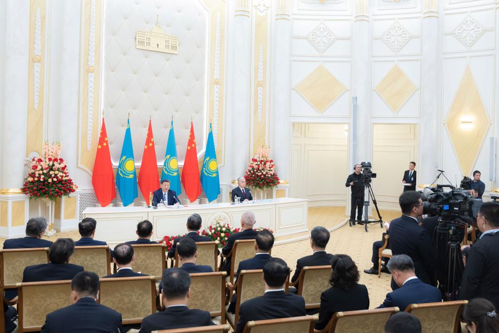 兩國元首共同簽署《中華人民共和國和哈薩克斯坦共和國聯(lián)合聲明》,并共同見證交換經(jīng)貿(mào)、互聯(lián)互通、航空航天、教育、媒體等領(lǐng)域數(shù)十項(xiàng)雙邊合作文件。