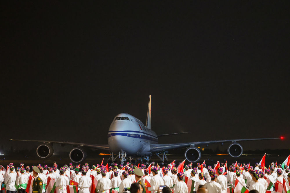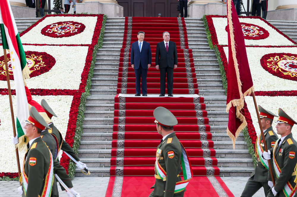 專機(jī)抵達(dá)杜尚別國(guó)際機(jī)場(chǎng)時(shí),拉赫蒙率高級(jí)官員熱情迎接。塔吉克斯坦兒童向習(xí)近平獻(xiàn)花,用中、塔文歡迎習(xí)近平主席到訪。兩國(guó)元首在機(jī)場(chǎng)共同欣賞青年們表演的中塔歌舞。