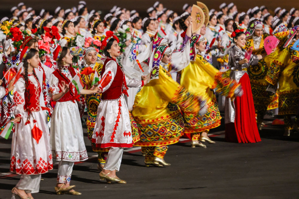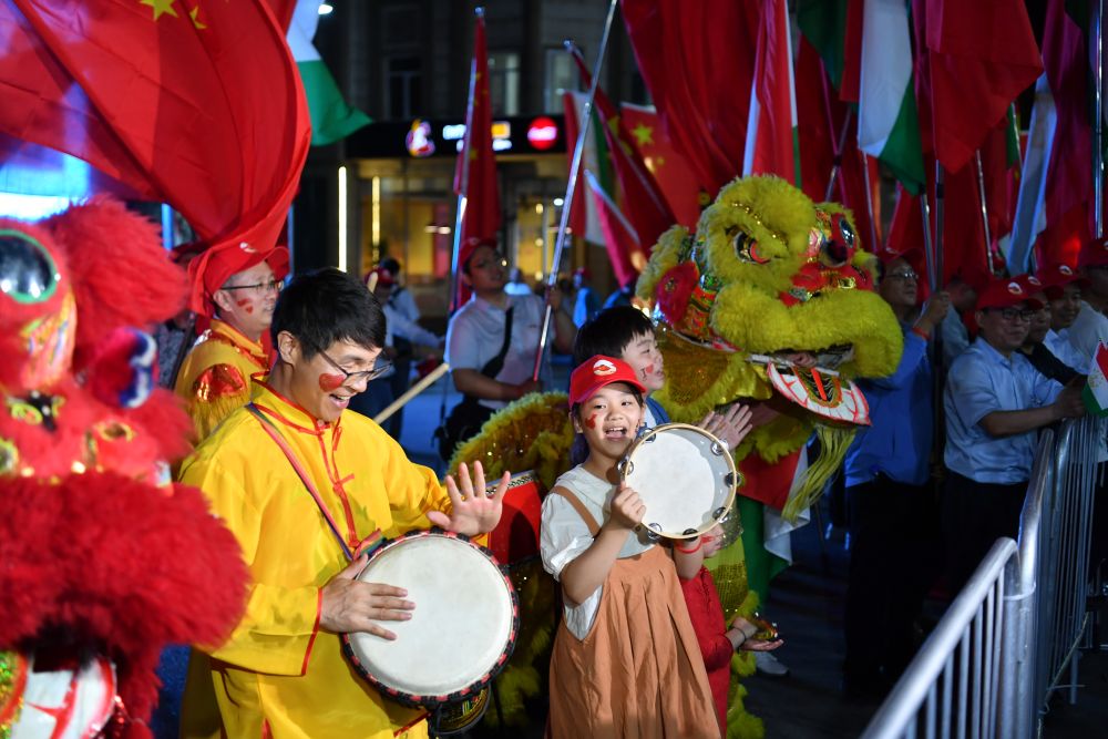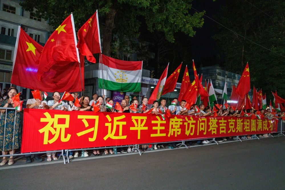 1500多名身著民族盛裝的塔吉克斯坦青年表演富有濃郁特色的中塔歌舞,揮舞中塔兩國(guó)國(guó)旗,表達(dá)對(duì)中國(guó)最尊貴客人的熱烈歡迎。