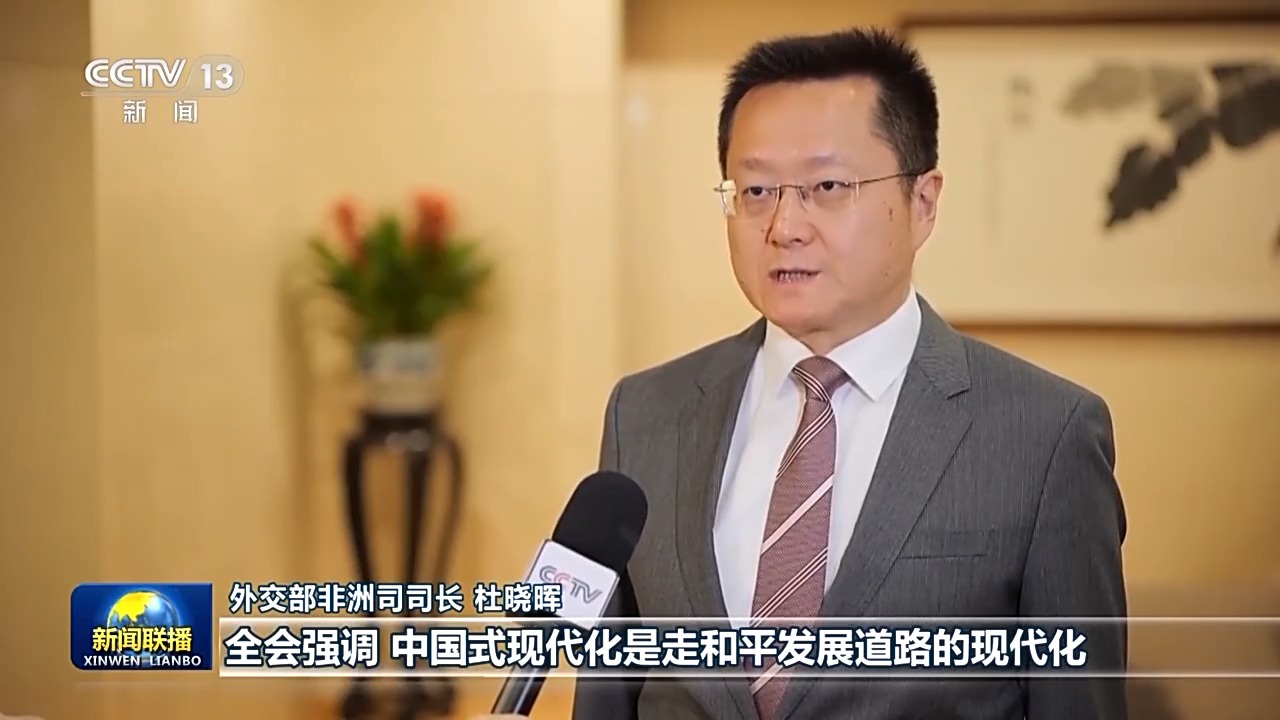 外交部非洲司司長 杜曉暉:全會強調(diào),中國式現(xiàn)代化是走和平發(fā)展道路的現(xiàn)代化,開放是中國式現(xiàn)代化的鮮明標識。在百年變局加速演進、世界進入新的動蕩變革期的大背景下,三中全會給世界注入和平力量、穩(wěn)定力量、進步力量、發(fā)展力量。我們將以習近平外交思想為指引,堅定奉行獨立自主的和平外交政策,推動構(gòu)建人類命運共同體,為以中國式現(xiàn)代化全面推進強國建設(shè)、民族復興偉業(yè)營造更有利國際環(huán)境、提供更堅實戰(zhàn)略支撐。