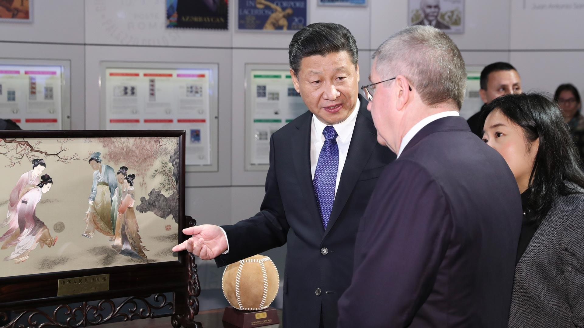 2017年1月,習近平主席在訪問瑞士期間專程來到坐落在洛桑半山腰的國際奧林匹克博物館。這是中國國家元首首次到訪。習近平主席代表中國向國際奧委會贈送了蘇繡《仕女蹴鞠圖》,并在留言簿上用中文寫下:“弘揚奧運精神,促進和平發(fā)展”。