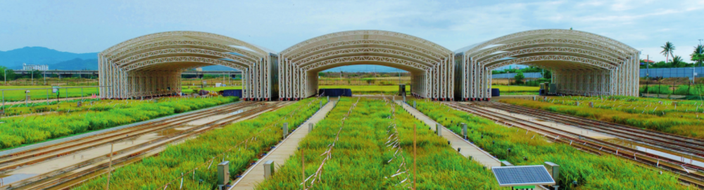 在位于三亞的國家耐鹽堿水稻技術(shù)創(chuàng)新中心崖州灣總部科研試驗(yàn)基地,建設(shè)了高標(biāo)準(zhǔn)試驗(yàn)田、鹽(堿)性精準(zhǔn)鑒定鹽池、自動(dòng)防雨鋼棚、水土鹽堿度智能化監(jiān)測(cè)系統(tǒng)等配套設(shè)施(2024年5月17日攝)。黎多江攝/本刊