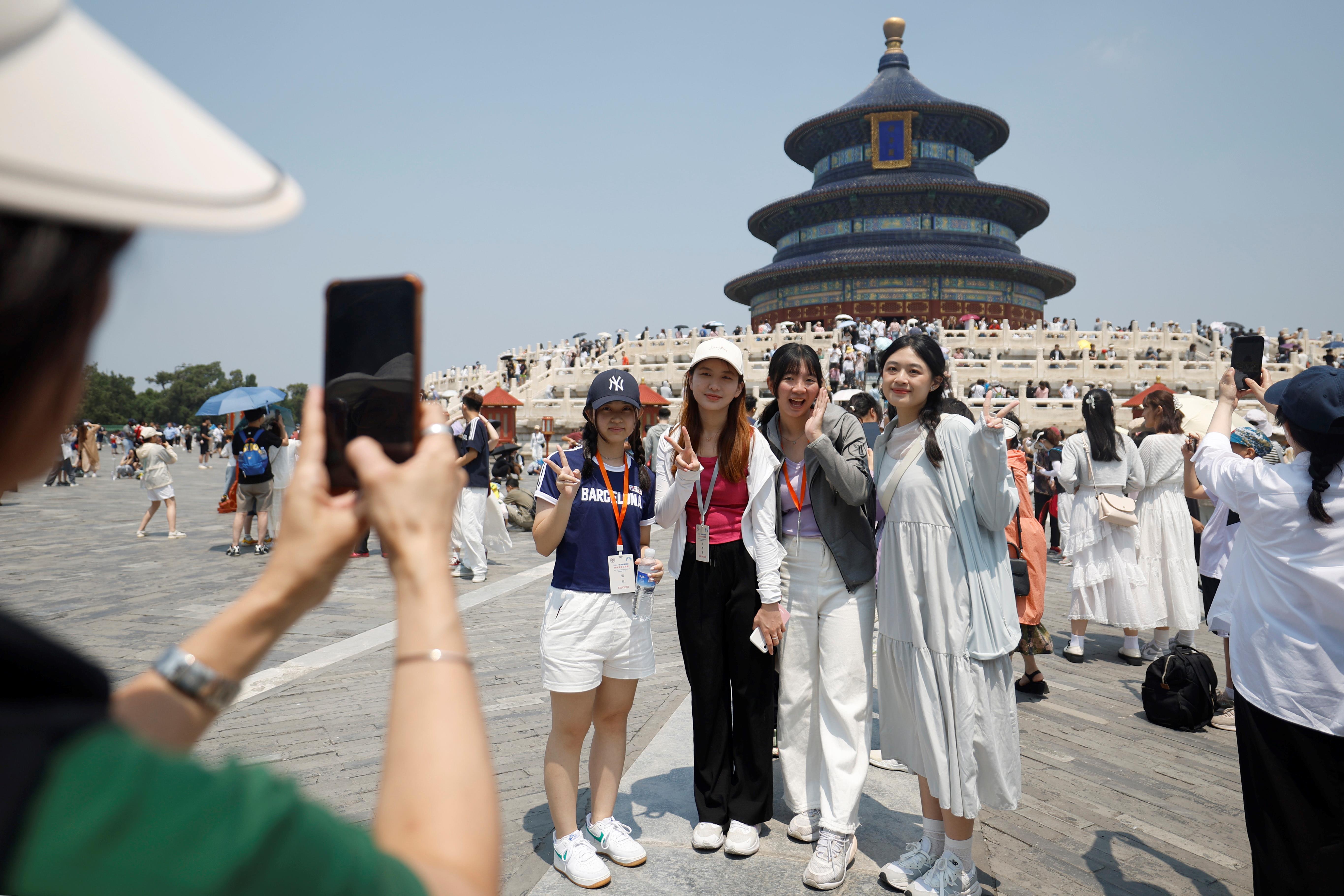 2024年7月3日,臺灣青年在天壇公園拍照留念。當(dāng)日,2024“未來能源領(lǐng)袖”兩岸青年交流營的營員參觀游覽北京的奧林匹克公園、天壇公園等地。