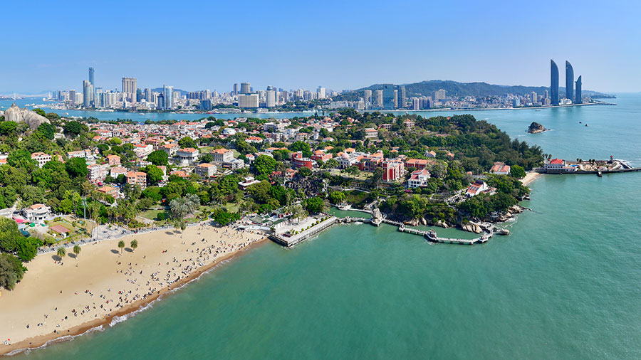 游人在廈門(mén)鼓浪嶼沙灘上游玩(無(wú)人機(jī)照片)。新華社記者 姜克紅 攝