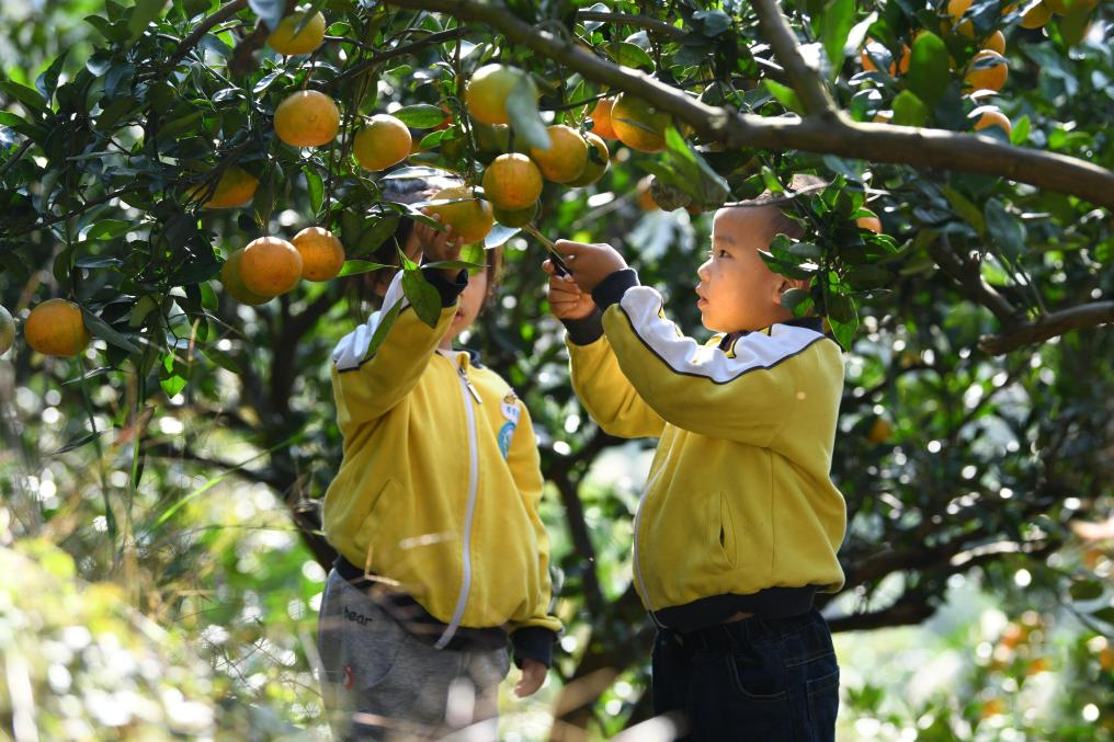 貴州黃平縣小朋友在校外勞動實踐基地采摘柑橘。