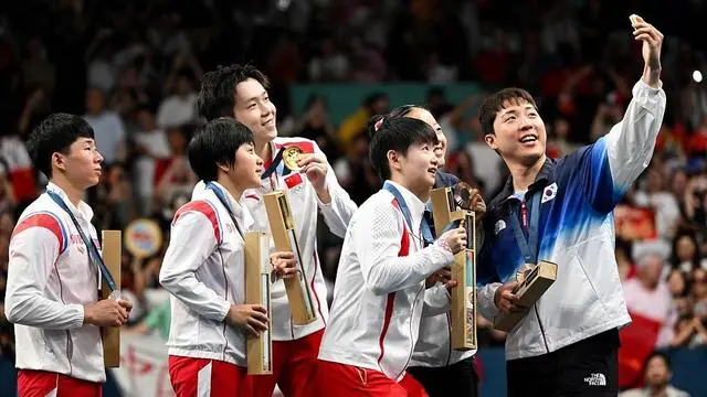 巴黎奧運(yùn)會乒乓球混合雙打頒獎儀式結(jié)束后,中朝韓運(yùn)動員聚到一起合影的場景,在朋友圈刷了屏。