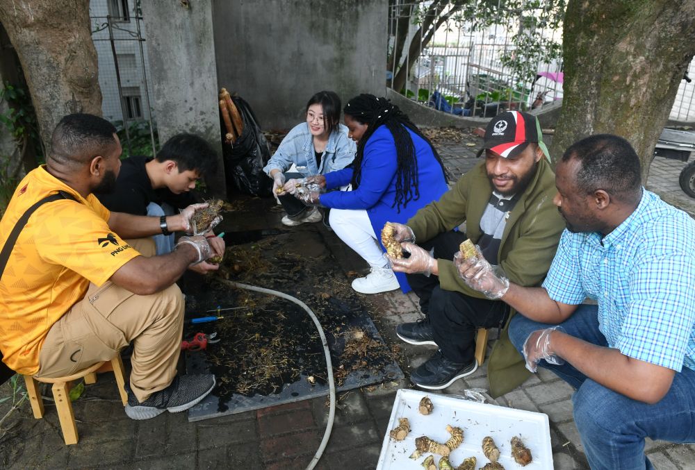 3月28日,在位于福州的福建農(nóng)林大學(xué),來(lái)自盧旺達(dá)和巴布亞新幾內(nèi)亞的學(xué)生與菌草專業(yè)學(xué)生交流。新華社記者 林善傳 攝